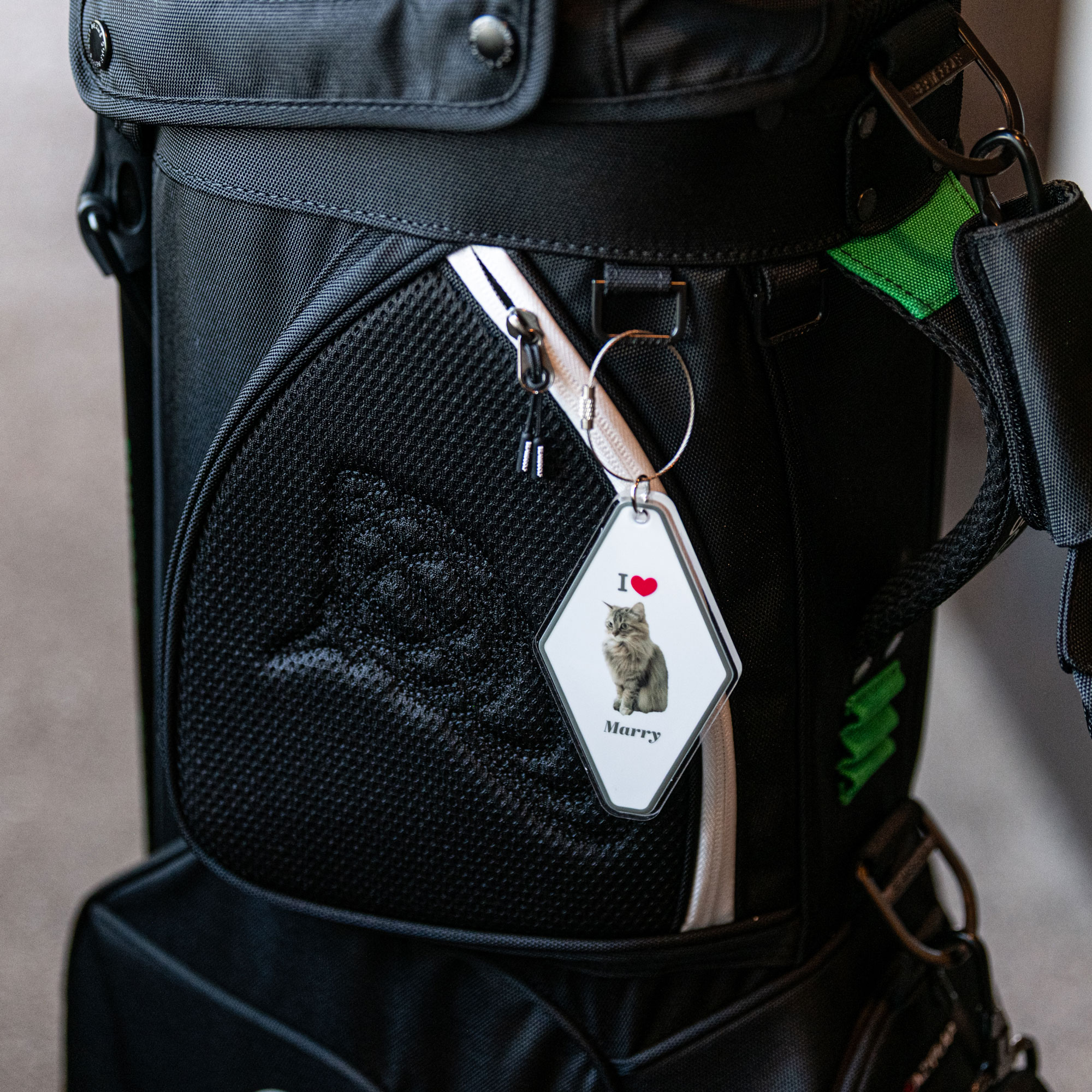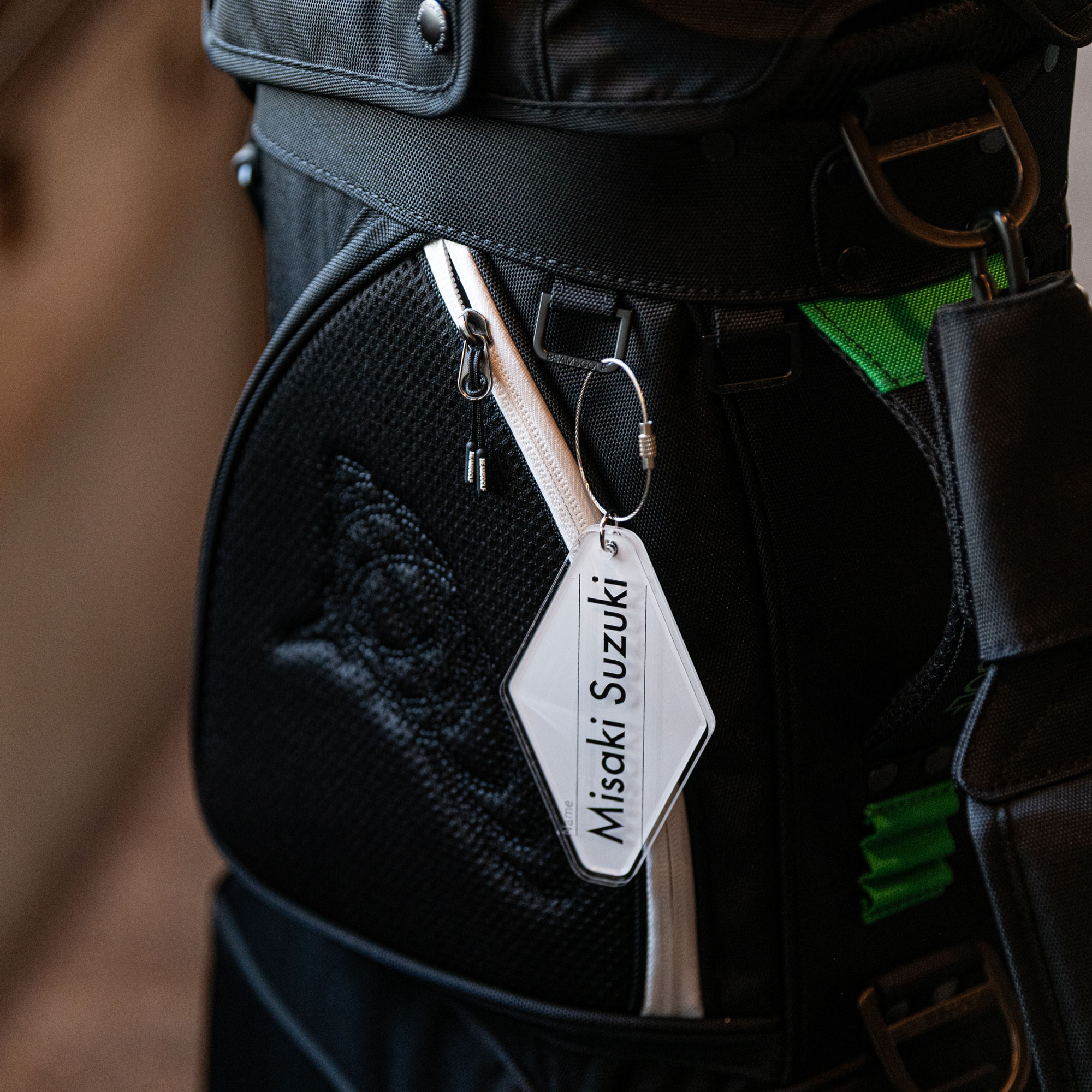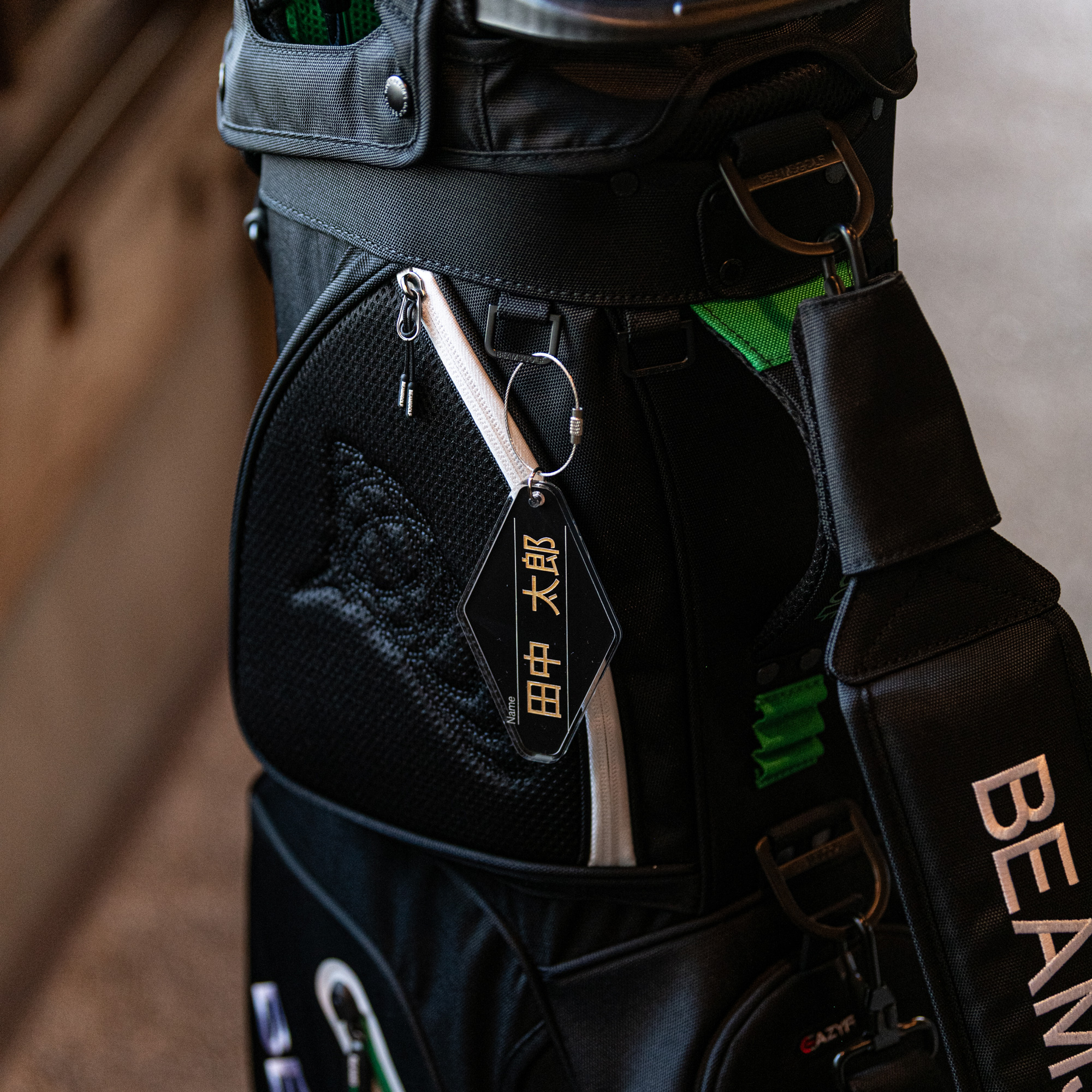 キャディバッグを引き立てる名入れタグ。日常のラウンドにも、上質なギフトシーンにもふさわしい逸品です。